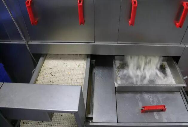使用過的餐盤經周轉車運送至洗消線后,由工作人員將餐具放置在洗消線上,洗消流程開始。